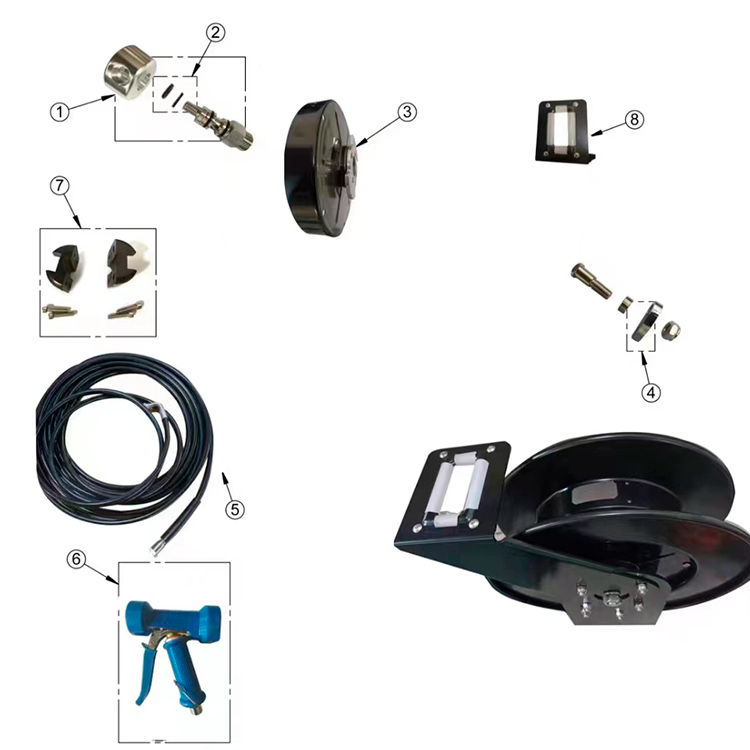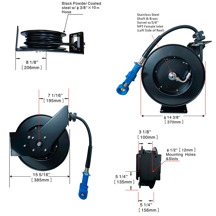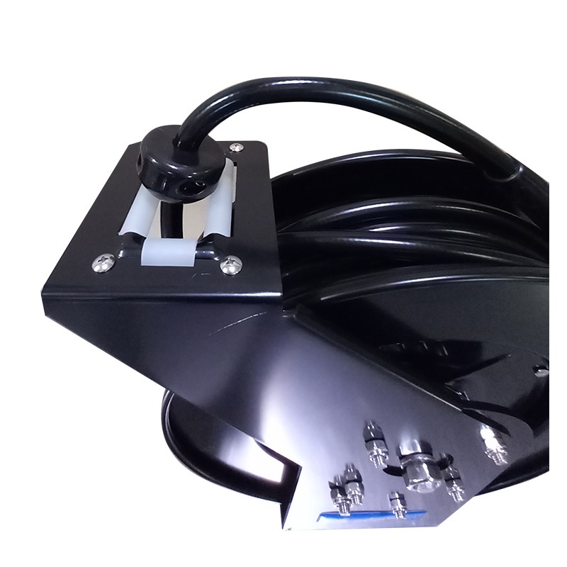 Sistema de manguera retráctil, enrollable en el interior, con sistema de bloqueo que permite mantener sin esfuerzo la longitud de manguera deseada en cada uso.