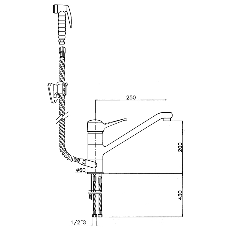 Grifo monomando de 2 aguas con ducha y soporte a la pared. Longitud del flexible 1.000 mm.